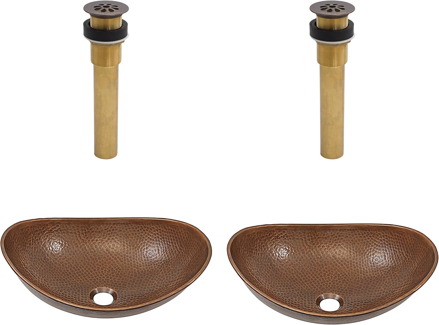 Design your dream bathroom retreat around the Confucius copper sink dual vanity kit by Sinkology. This kit includes two sinks and two matching grid drains to outfit your master bathroom with the perfect bath sink duet. The new and improved design of this vessel sink reduces splashing and keeps water where it belongs. Unique and Innovative this copper bath sink makes a luxurious statement in any bathroom. Handmade from 18 gauge pure solid copper the Confucius is hand finished in our most popular Antique copper finish. Easy to maintain, affordable and protected by a Lifetime .